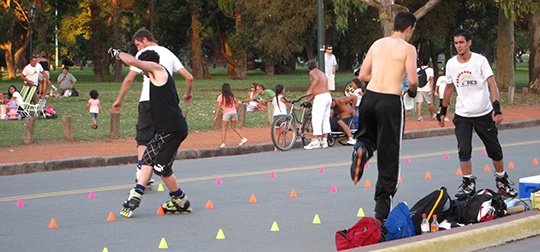 Rollerblading is a popular activity. It is inexpensive to rent the skates and experts mix with weekend warriors. This self-made obstacle course gives the experts a chance to show their artistry. They are amazing…