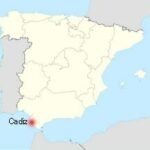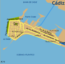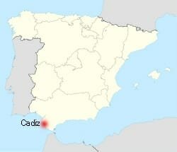 The map at left shows the relative location of Cádiz while on the map to the right you can see its unique position on a peninsula with the old city located at the end.