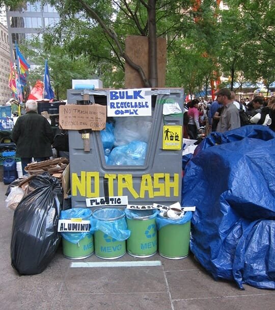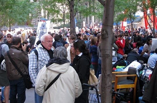 This movement is taking place in a surprisingly small plaza. Yes there are trees, but to call it a “park” doesn’t capture the setting. This is a cement enclave near Wall Street and The World Trade Center Memorial, the size of a city block minus much of the block taken up by wide sidewalks. They are operating at close quarters.