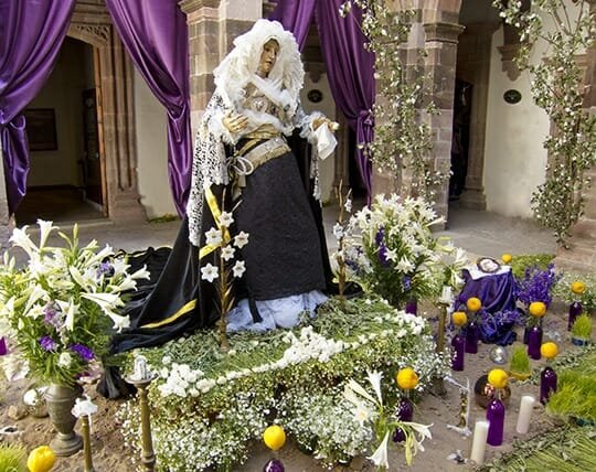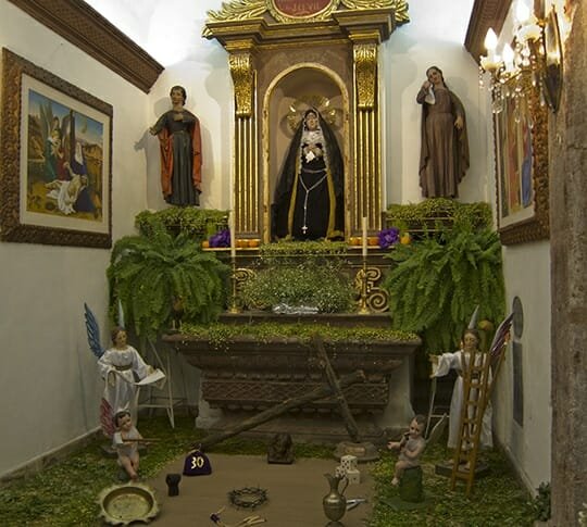 The San Miguel celebration started on Friday March 30, on that day, Our Lady of Sorrows, San Miguel is adorned in purple, white and green. Homes, businesses and public spaces decorate altars that are on display late into the night. The display hosts offer visitors fruit drinks or ice cream.