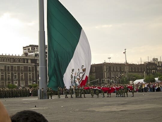 As we exited the cathedral, a crowd was forming around the Zócalo. A military detail exited the Palacio in full dress uniform. Horns trumpeted as they marched toward the massive national flag.