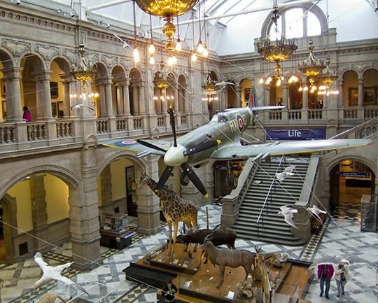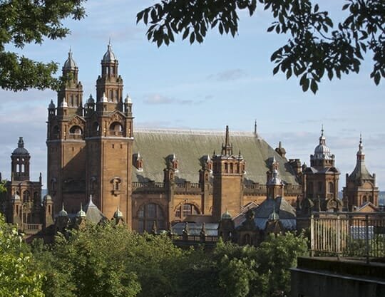 Looking at Kelvingrove Art Gallery and Museum from the university campus. This museum and the National Museum of Scotland in Edinburgh are remarkable in that they are museums with natural history, science and technology and history, as well as art galleries — literally something for everyone. Also, they are both admission free!