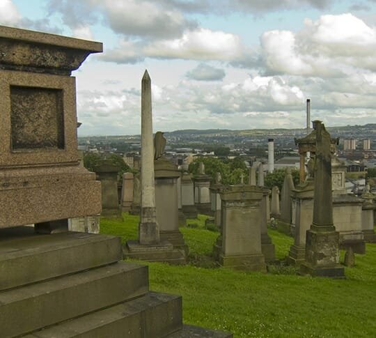 The Glasgow Necropolis land was made into a cemetery for the upper classes in the 1800s. It is adjacent to the Glasgow Cathedral and affords beautiful views of the cathedral and the city.
