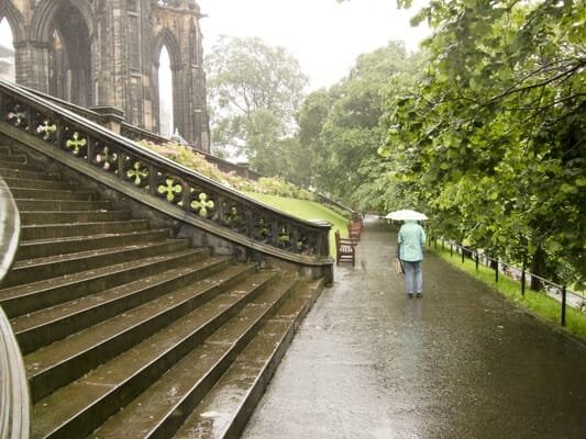 Did we say we had lots of rain? Here I am under the umbrella in East Princes Street Gardens near the Scottish National Gallery with part of the Walter Scott Monument on the left.