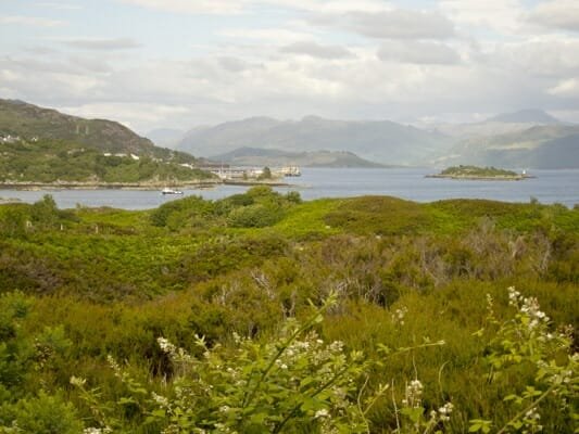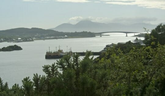 At last, our first glimpse of the Skye Bridge that would take us to the Isle of Skye. The Cuillin Hills in the background, we’re told, are rarely seen without their cloud halos.