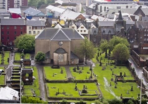 A cemetery and church as seen from Calton Hill — churches and cemeteries are not only prominent and beautiful in Scotland but also full of history. A famous church and burial ground in Edinburgh is Greyfriars Kirk where the renowned Greyfriars Bobby is buried.