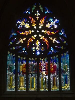 Beside Linlithgow Palace sits the 15th-century St. Michael’s Kirk, and this glorious stained glass window is full of symbolism.