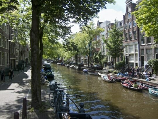 View down a canal with boats, bikes and beautiful architecture of Amsterdam. Five weeks of slow travel.
