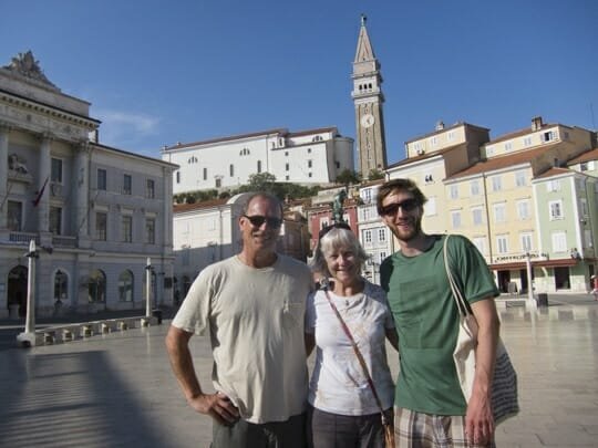 Plaza in Piran, Slovenia with our son Donald. Slow travel at its best